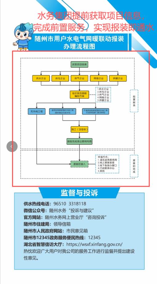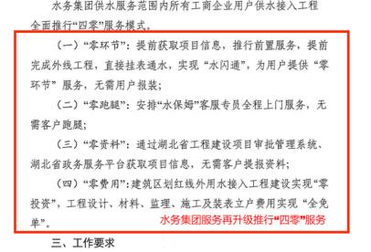1.“零環(huán)節(jié)”:客戶需要用水時(shí),即時(shí)通水; 2.“零跑腿”:安排“客服專員”全程上門服務(wù),無需客戶跑腿; 3.“零資料”:通過湖北省工程建設(shè)審批系統(tǒng)、湖北省政務(wù)服務(wù)平臺獲取項(xiàng)目信息,無需客戶提報(bào)資料; 4.“零費(fèi)用”:針對企業(yè)用戶供水接入項(xiàng)目,工程設(shè)計(jì)、材料、監(jiān)理、施工全部免費(fèi)。 |