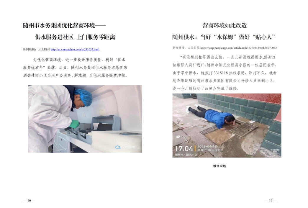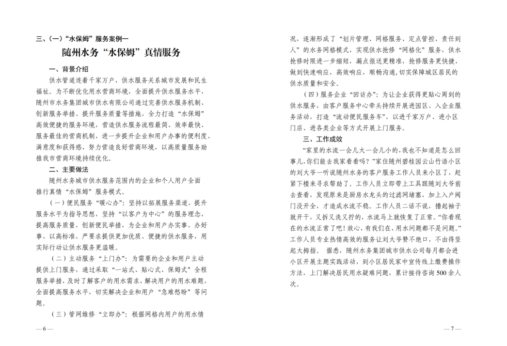 為全面提升供水服務(wù)水平,優(yōu)化供水營(yíng)商環(huán)境,隨州水務(wù)集團(tuán)推出“水保姆”供水服務(wù)新模式,建立“供水服務(wù)網(wǎng)格員”隊(duì)伍,通過(guò)開展清表核查、網(wǎng)格劃分、聯(lián)合社區(qū)共同解決用戶問(wèn)題等亮點(diǎn)行動(dòng),讓百姓暖心,讓企業(yè)放心。