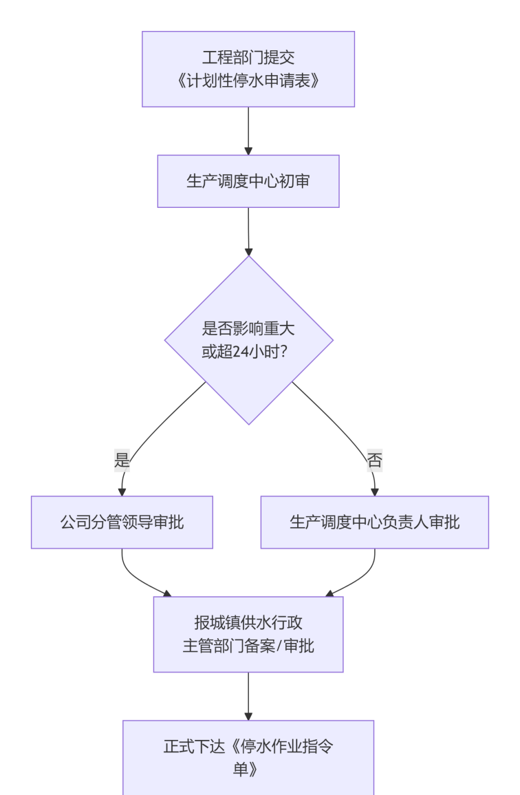 內(nèi)部審批:調(diào)度中心對停水的必要性、時長和范圍進行初審。影響范圍廣或停水時間預(yù)計超過24小時的重大作業(yè),需報公司分管領(lǐng)導(dǎo)批準。
